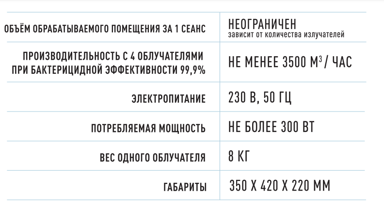 Установка для обеззараживания воздуха, несмотря на свое технологически сложное устройство, довольно проста в управлении. Схема размещения облучателей и длительность сеанса обработки рассчитываются с учетом размера и формы конкретного помещения, расположения в нем оборудования, особенностей его эксплуатации, чтобы обеспечить режим бестеневого излучения. Это позволяет создать так называемый эффект «светового котла», дающий максимальную эффективность обеззараживания (99,9% и выше) всего помещения.